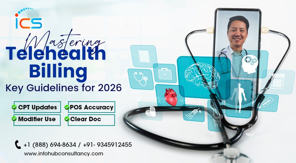 Offshore telehealth billing and coding services in India to InfoHub Consultancy Services provide practices with a reliable, efficient way to comply with the detailed 2026 guidelines. ICS ensures every claim is accurately coded, adequately documented, and fully compliant with Medicare and payer-specific requirements, minimizing denials and audit risks. Their team tracks patient consent, visit limits, and time-based billing while seamlessly managing split/shared services. Also, ICS keeps practices aligned with evolving telehealth rules by staying up to date on regulatory changes. This allows providers to improve revenue cycle efficiency and maintain financial stability, making outsourcing a strategic choice for telehealth success.